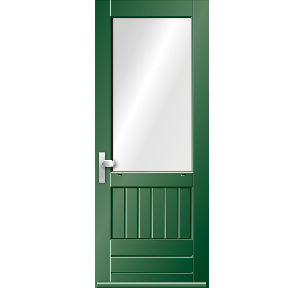 Voordeur 9607N is een massieve hardhouten voordeur, voorzien van een 1-zijdig geïsoleerd bossingpaneel met groeven aan de buitenzijde.